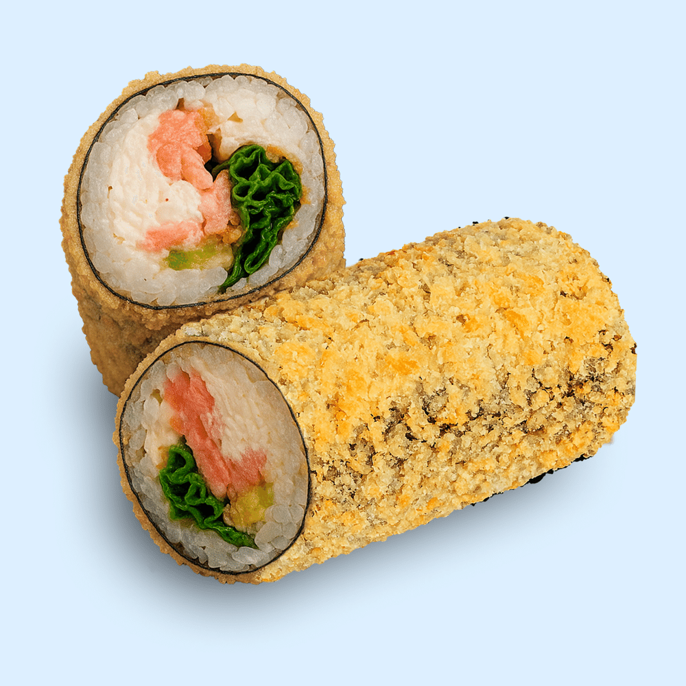 Горячий снаружи, сочный внутри. Донер, который выбрал путь суши. Состав: Нори, рис, краб с майонезом, лосось с/с, огурец, авокадо, лист салата, кранч-лук, кляр, панировочные сухари.