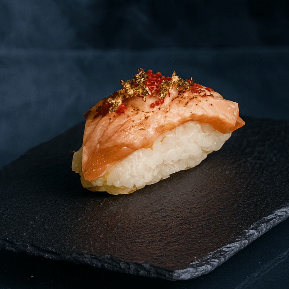 Разбавляем серость будней золотым блеском и сочным лососем. Немного огня — и твой вечер становится праздником.Состав: Рис, лосось, соус Унаги майо, тобико, сусальное золото.