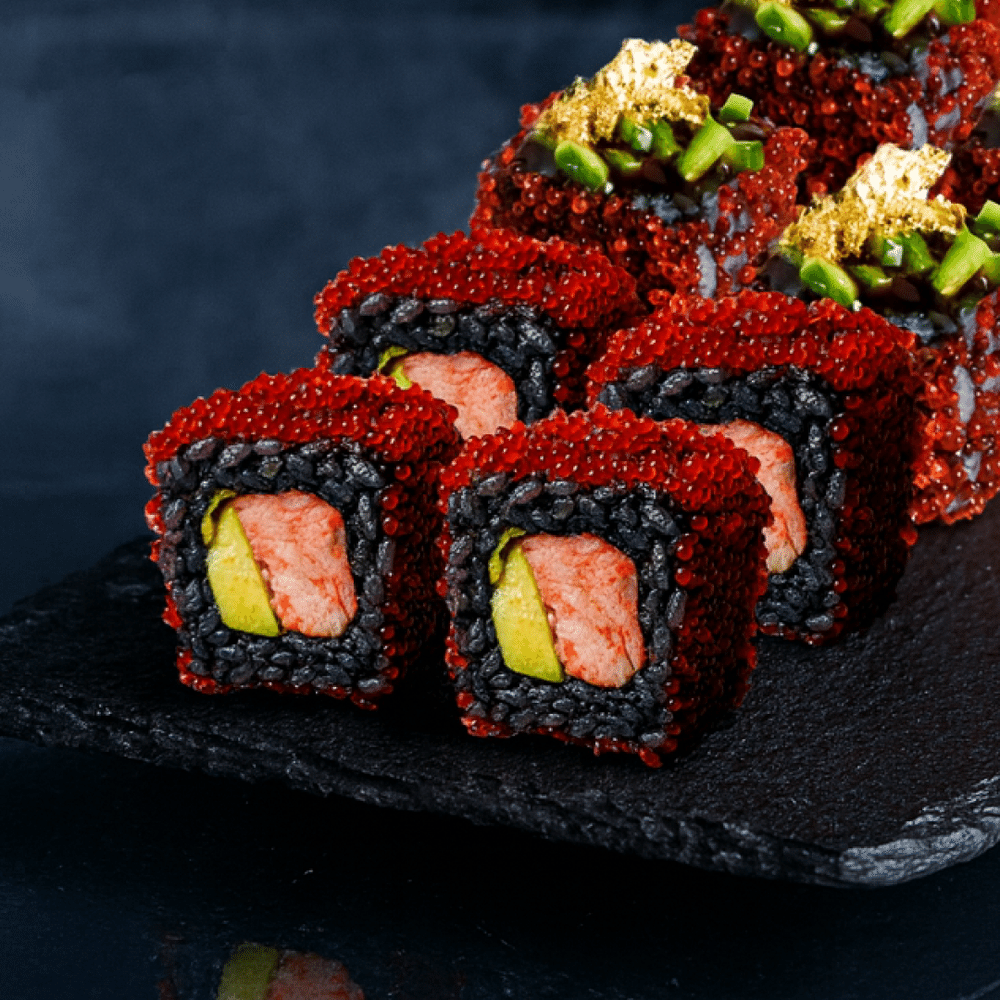 Любишь роскошь? Здесь твоя порция счастья! Блестит лучше любых украшений.Состав: Нори, чёрный рис, лосось, краб-майонез, авокадо, тартар из огурца, сусальное золото, тобико.